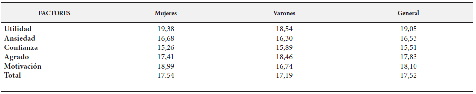 En la tabla 2 se aprecia que el factor con mayor puntaje promedio en mujeres es motivación, en caso de los varones es agrado.
