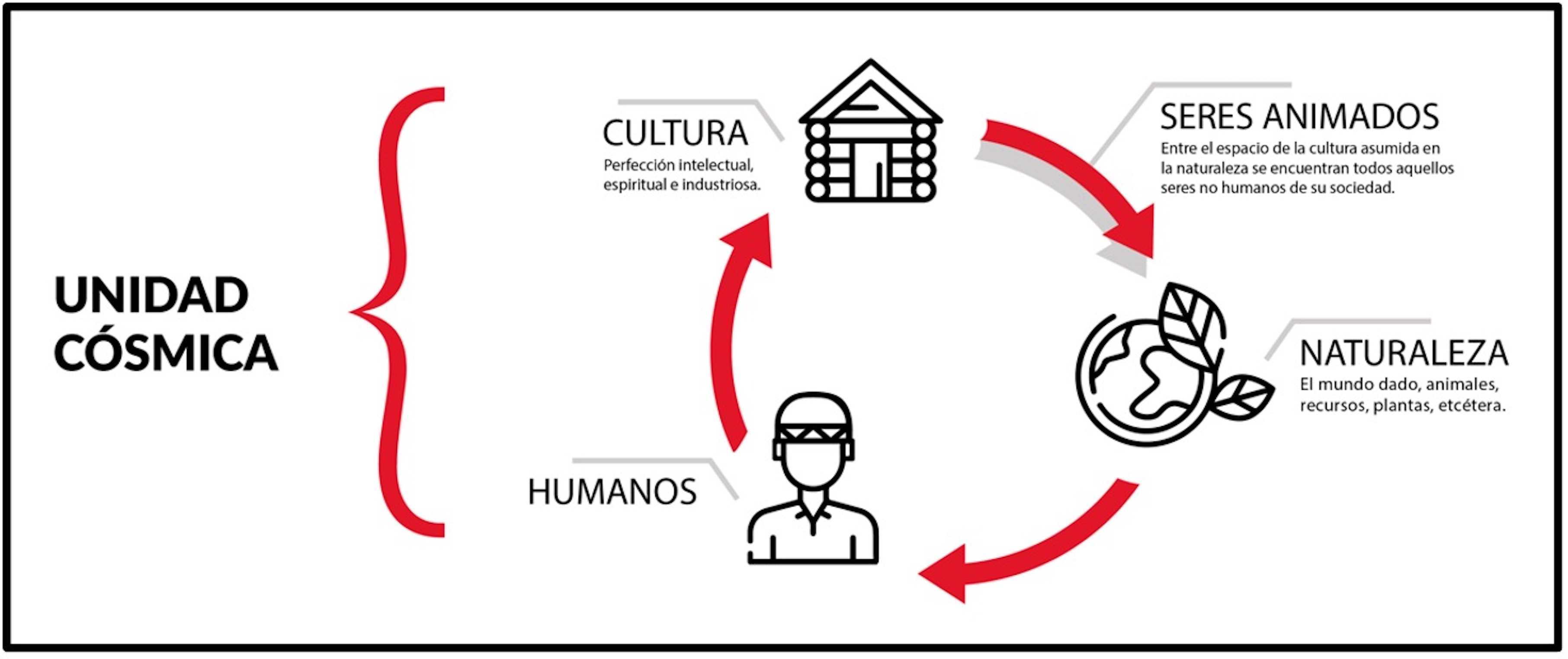 De este modo, es necesario reflexionar sobre las implicaciones conceptuales de cultura y naturaleza, así como su relación con el punto de vista rarámuri para alcanzar la “traducción intercultural”. A continuación, expongo las aproximaciones teóricas de Isabel Martínez (2008) y Enrique Servín (2015), aunado a algunas experiencias de trabajo de campo, que se sitúan en las mismas coordenadas que las “epistemologías del sur”, que muestran aproximaciones conceptuales desarrolladas desde su mismo punto de vista y sirven de ejemplo sobre cómo los saberes rarámuri tienen potencial benéfico para ser considerados en la construcción de un conocimiento pluriversal. En primer lugar, Isabel Martínez, en su tesis de maestría Los caminos rarámuri: persona y cosmos en el noroeste de México (2008), nos da las bases para observar desde otro ángulo la idea de cultura con la propuesta de “unidad cósmica” como categoría que mantiene en sintonía diversos aspectos heterogéneos que fluyen en una misma dirección sobre su concepción de mundo, tal como se puede apreciar en la figura 3.