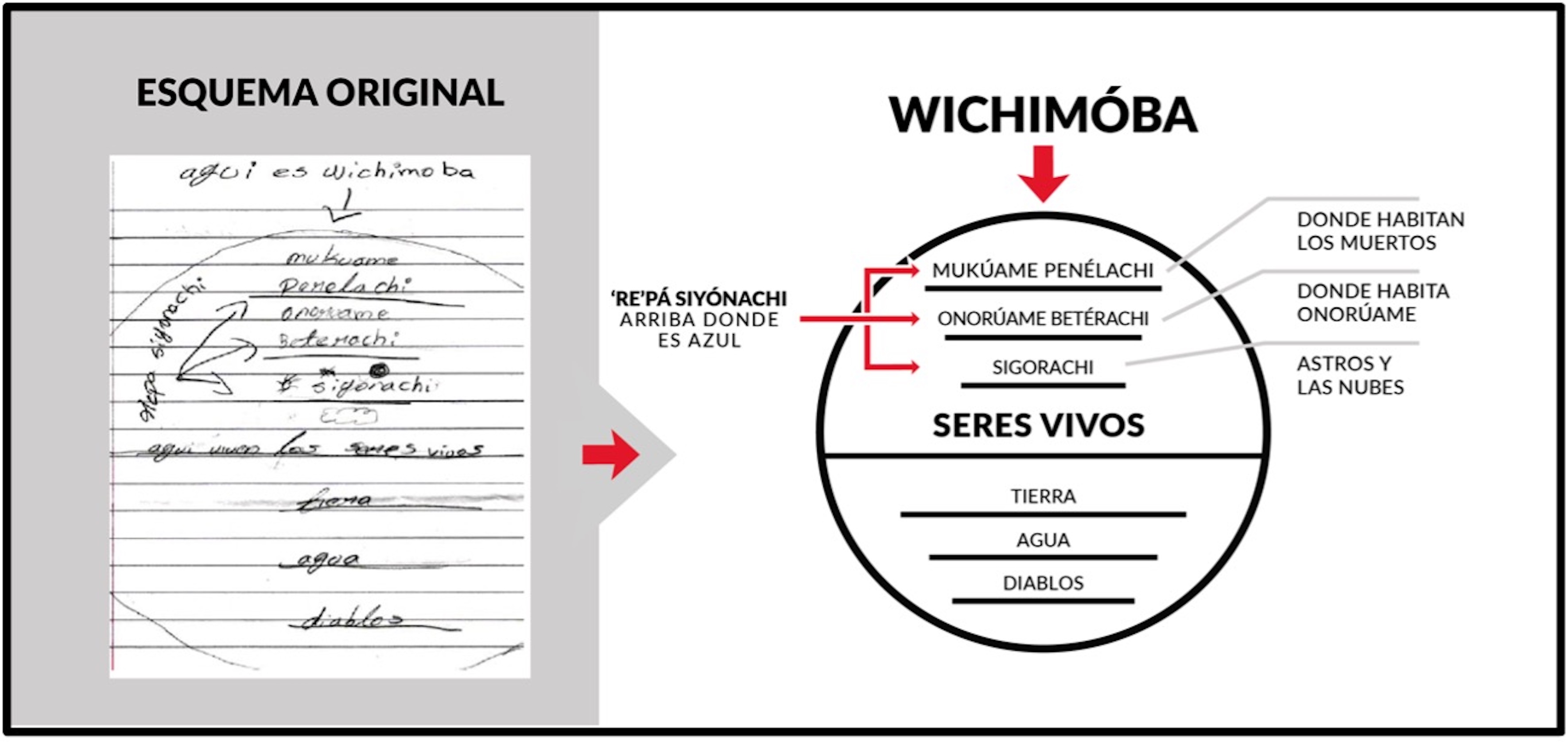 El esquema original, que se aprecia en la parte izquierda de la figura anterior, fue realizado por Angelita Loya, una mujer rarámuri de la comunidad de Norogachi. En él se aprecia la forma en que se concibe el wichimóba, entendido como un todo integrador que contiene no solo el espacio habitado por los seres humanos, sino también por los demás miembros de su sociedad, incluido lo no humano, junto al contexto natural que los rodea. Así, este esquema nos proporciona pautas que justifican la unidad cósmica como una propuesta para pensar la naturaleza desde un punto en el que podemos cuestionar los fundamentos de las dicotomías occidentales de humano-naturaleza y naturaleza-cultura.