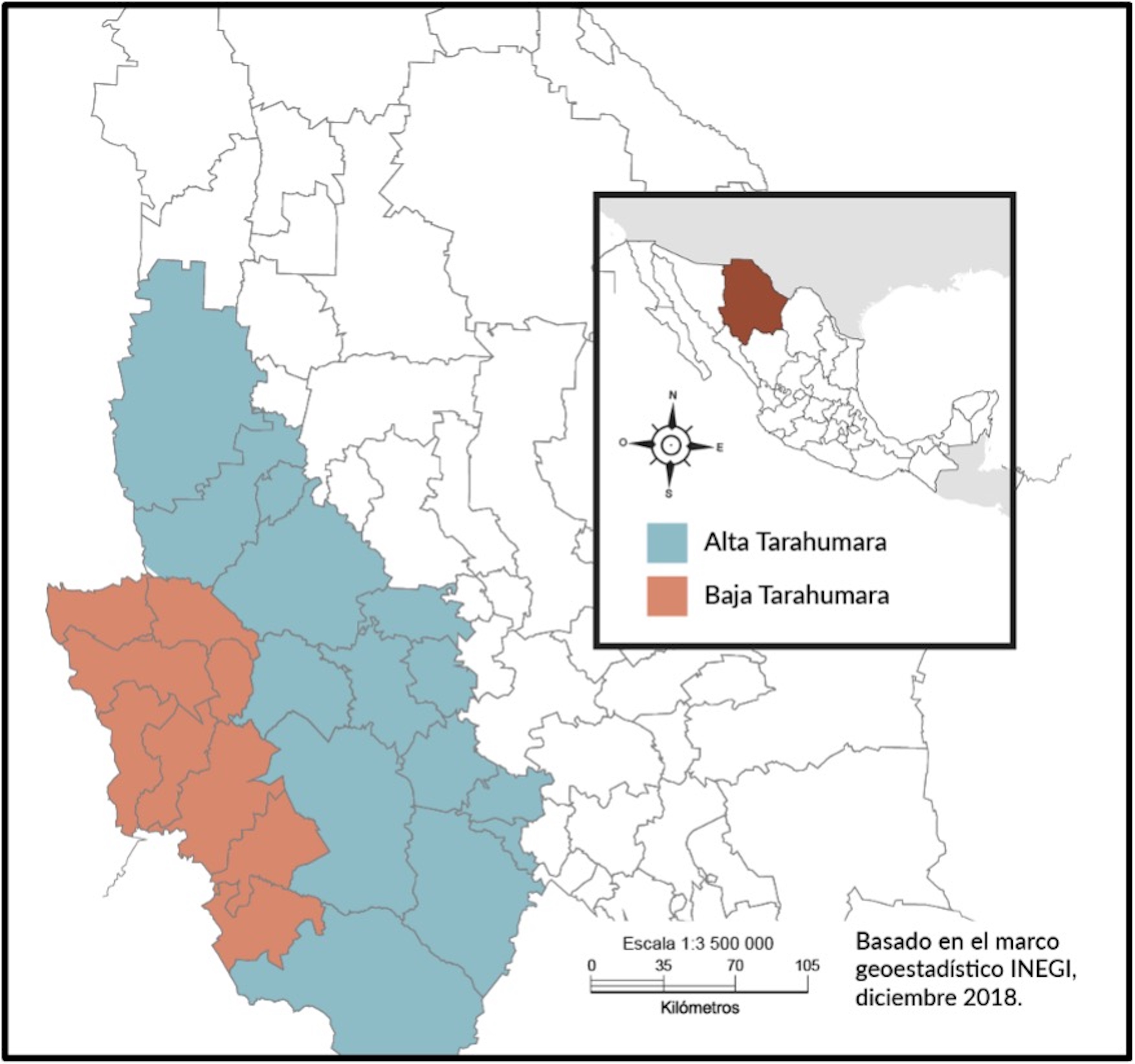 Al igual que todos los grupos humanos, estos pueblos viven en un complejo tramado sociocultural donde se llevan a cabo diversas prácticas que inciden en la construcción y continua actualización de su identidad, que los lleva a concepciones de mundo[5]singulares. En particular, me concentraré en aquellos que habitan en la región biogeográfica denominada Alta Tarahumara. Se trata de una zona boscosa que se extiende alrededor de 12 000 km2. En la figura 2 se observa el mapa donde se muestra la ubicación de la región.