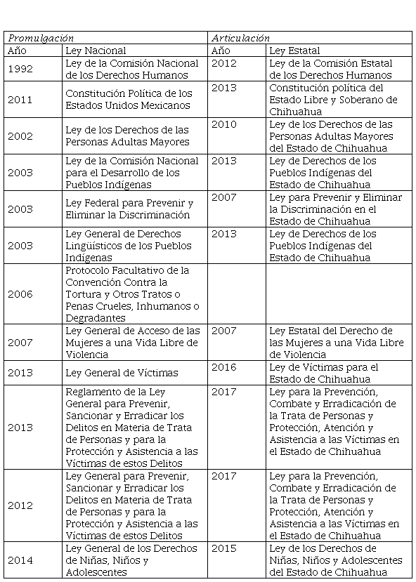 En cuanto a la articulación de los ordenamientos aplicables para el respeto y protección de los dh, Chihuahua se ha caracterizado por una respuesta oportuna, es decir, con una normatividad, de acuerdo con las necesidades y presiones locales, como se muestra en la Tabla 1.