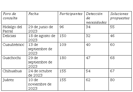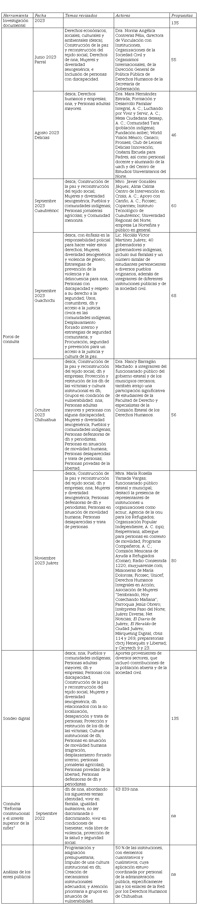 1) foros de consulta ciudadana, A través de mesas de análisis en diversas temáticas, llevadas a cabo en las principales regiones del estado: Chihuahua, Ciudad Juárez, Delicias, Hidalgo del Parral, Guachochi y Cuauhtémoc; 2) Recolección y análisis de información. De la información que las dependencias del Gobierno Estatal, así como otros Poderes y Organismos Públicos Autónomos, tienen en su poder acerca de los avances y desafíos en derechos humanos; 3) consulta “reforma constitucional y el interés superior de la niñez” Destinada a niñas, niños y adolescentes de 6 a 17 años, esta iniciativa fue promovida por el H. Congreso del Estado y desarrollada en colaboración con el Instituto Estatal Electoral; 4) Sondeo digital. Implementado mediante una plataforma específica, con la asesoría del Instituto Estatal Electoral para recopilar opiniones y propuestas relacionadas con diversos temas y derechos, (pedh, 2024, p. 19)