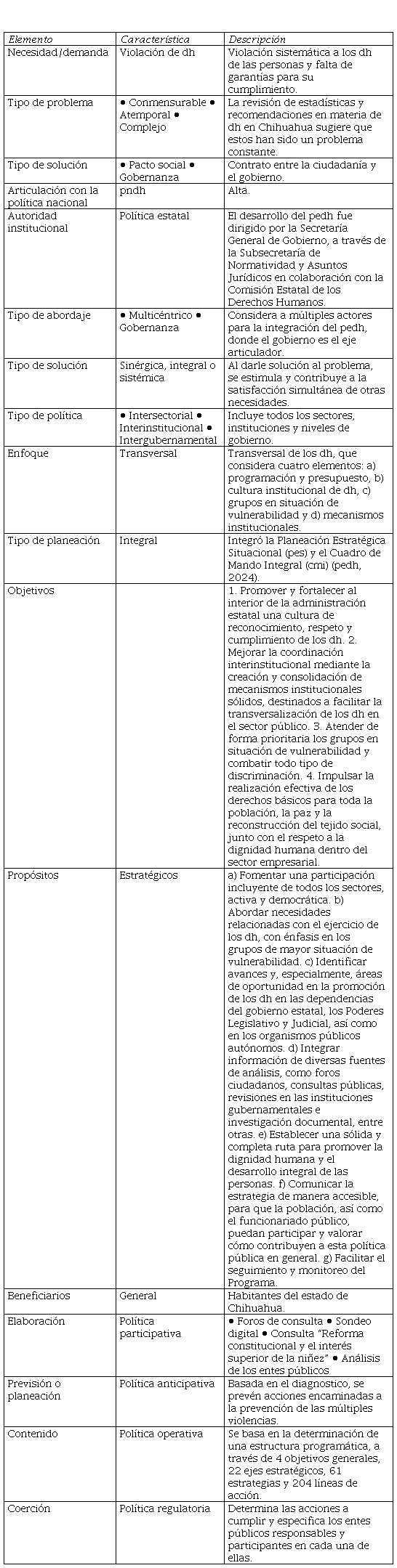 Como resultado del proceso de definición y decisión, el 13 de abril de 2024 se publicó en el Periódico Oficial del Gobierno del Estado Libre y Soberano de Chihuahua el anexo correspondiente al pedh, que sienta las bases de la política pública de dh en Chihuahua, y se reafirma la obligación del Estado de “respetar, proteger y hacer efectivos los derechos humanos” (acnudh, 2008, p. 7). De acuerdo con algunos elementos de las políticas públicas en la Tabla 4 se sintetiza el contenido del pedh.
