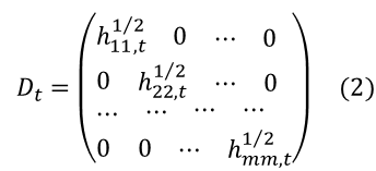 Dentro de la ecuación 1, 𝐷𝑡 representa la matriz diagonal de las desviaciones estándar condicionales, la cual se expresa en la ecuación 2 y se puede hallar mediante una estructura GARCH univariada que toma la forma de: