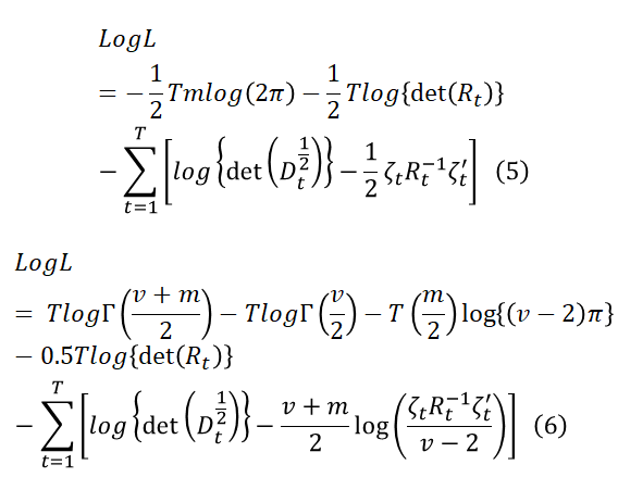 Para realizar la estimación en un solo paso, se puede utilizar una distribución multivariada, bajo una función de máxima verosimilitud Gaussiana o una función de máxima verosimilitud de student. La ecuación 5 presenta la aproximación para el caso de la función de máxima verosimilitud gaussiana, mientras que la ecuación 6 muestra la aproximación para la función de máxima verosimilitud de student.