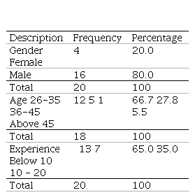 Of the total respondents, 16(80%) were male and 4(20%) were female. In terms of age, only 1(5.5%) was above 45 years, 5(27.8%) was between 36 and 45 years, and 12(66.7%) was between 26 and 35 years. In terms of experience in the company, 7(35%) had experience in the company between 10 and 20 years, while 13(65%) had less than 10 years of work experience.