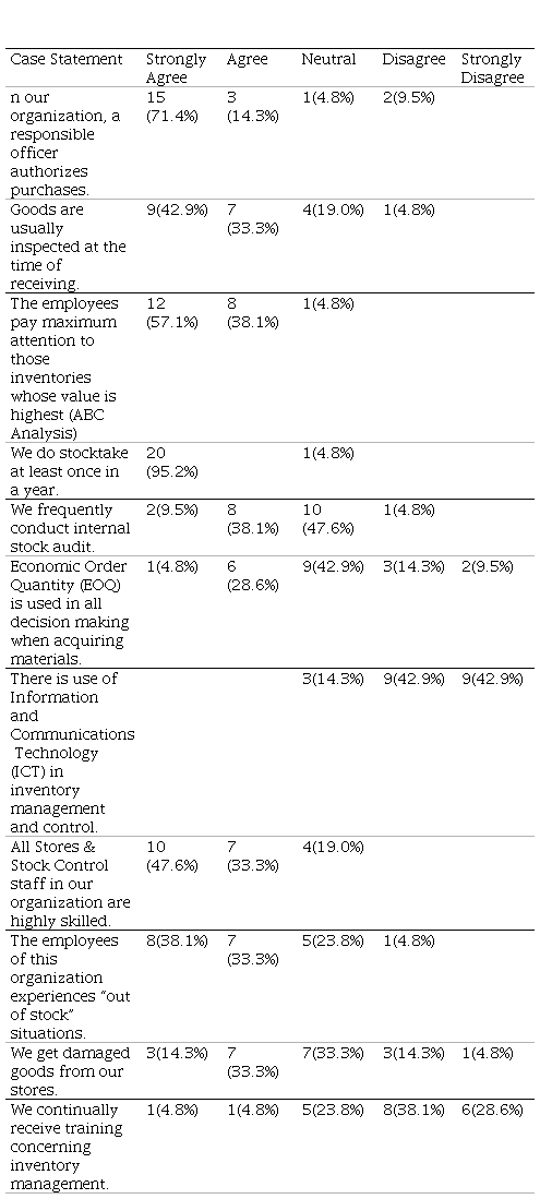 From Table 2 above, 15(71.4%) of the respondents strongly agreed that responsible officers authorize purchases, 3(14.3%) agreed, 1(4.8%) were not sure and 2(9.5%) disagreed. The table also shows that 9(42.9%) of the respondents strongly agreed that goods are usually inspected at the time of receipt, 7(33.3%) agreed, 4(19.0%) were not sure and 1(4.8%) disagreed. Among the total respondents, 12(57.1%) strongly agreed that employees pay special attention to inventory whose value is very high, 8(38.1%) agreed, 1(4.8%) were not sure. 20(95.2%) respondents also strongly agreed that inventory is taken at least once a year and 1(4.8%) was not sure. 2(9.5%) strongly agreed that internal inventory is conducted frequently, 8(38.1%) agreed, 10(47.6%) were not sure and 1(4.8%) disagreed. Only 1(4.8%) of the respondents agreed that Economic Order Quantity is used in all decisions when purchasing materials, 6(28.6%) agreed, 9(42.9%) were not sure, 3(14.3%) disagreed and 2(9.5%) strongly disagreed. Of the total respondents, 3(14.3%) were not sure whether ICT is used in inventory management and control, 9(42.9%) disagreed and 9(42.9%) strongly disagreed. 10(47.6%) of the respondents strongly agreed that warehouse and inventory control personnel in TAZARA are highly skilled, 7(33.3%) agreed and 4(19.0%) were not sure. Of the total respondents, 8(38.1%) strongly agreed that TAZARA experiences out-of-stock situations, 7(33.3%) agreed, 5(23.8%) were not sure and 1(4.8%) disagreed. 3(14.3%) of the respondents strongly agreed that they receive damaged goods from the stores, 7(33.3%) agreed, 7(33.3%) were not sure, 3(14.3%) disagreed and 1(4.8%) strongly disagreed. Only 1(4.8%) strongly agreed that employees receive continuous training in inventory management, 1(4.8%) agreed, 5(23.8%) were not sure, 8(38.1%) disagreed and 6(28.6%) strongly disagreed.