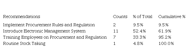 From Table 5 above, 11(52.4%) of the respondents recommended that there is need to introduce electronic management system in inventory management in TAZARA. 7(33.3%) recommended training of employees on procurement rules and regulations, 2(9.5%) recommended full implementation of procurement rules and regulations and 1(4.8%) recommended routine inventory taking.