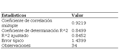 Para validar el modelo se procedió a realizar el análisis de varianza por medio de la tabla (ANOVA), que incluye la suma de cuadrados de la regresión (〖SC〗_r), de los residuos o errores (〖SC〗_e) y la total (〖SC〗_yy), a partir de las siguientes expresiones:
