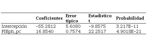 Obtenidos los coeficientes, se procedió a conformar la ecuación para la estimación de la esperanza de vida, en función del producto interno bruto per cápita o por habitante, resultando de la siguiente manera: