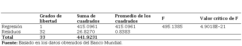 El análisis de varianza (ANOVA) revela información crucial sobre la relación entre las variables en estudio. El valor de F obtenido (495.1385) es notablemente alto, lo que sugiere una fuerte relación entre las variables. Este valor de F se utiliza para evaluar la significancia estadística global del modelo de regresión. En otras palabras, indica si el modelo en su conjunto es útil para predecir la variable dependiente, o si la variable independiente considerada en el modelo tiene un efecto real sobre ella.