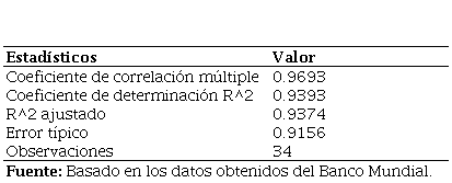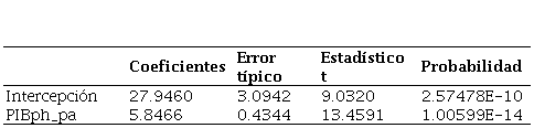 Tabla 10. Resultados estadísticos de la regresión, con el PIB per cápita, a precios constantes de 2015.