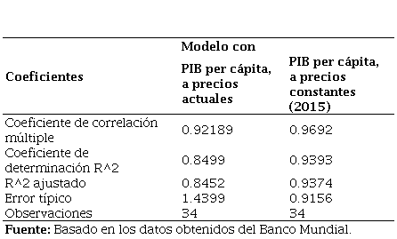 El modelo que usa el PIB per cápita, a precios constantes de 2015, presenta un mayor coeficiente de correlación, mismo que establece el grado de relación existente entre las variables.