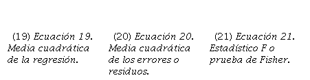 Además, se procedió a la estimación de la media cuadrática de la regresión y de los residuos, para aplicar la prueba de Fisher (𝐹), para validar los coeficientes que conforman la ecuación del modelo, pero en este caso, no a nivel individual, sino más bien, a nivel de conjunto, dentro del modelo. Para ello se utilizaron las siguientes expresiones: