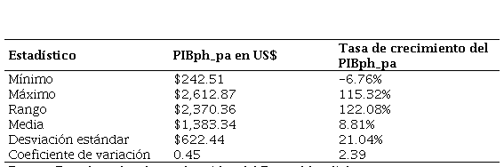La tasa de crecimiento del producto interno bruto per cápita, a precios actuales, experimentó su mayor fluctuación entre 1993 y 1994, con un aumento del 115.32%. Este valor atípico podría explicar la considerable variabilidad observada en los datos, esto puede conducir a sesgar el análisis general de esta variable.