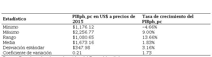 La tasa de crecimiento producto interno bruto per cápita, a precios constantes de 2015, experimentó su mayor fluctuación en los períodos de 2008-2009, (-4.66%), 2017-2018 (-4.63%) con disminución en las tasas de crecimiento, por otra parte, entre 2020 y 2021, con un aumento del 9.00%.