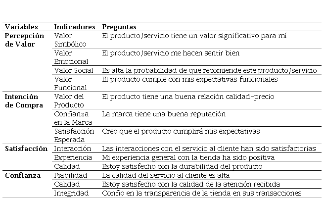 Se llevó a cabo una encuesta de 13 ítems utilizando la escala PERVAINCONSA que abarca cuatro variables clave: Percepción de Valor (Valor Simbólico, Valor Emocional, Valor Social, Valor Funcional), Intención de Compra (Valor del Producto, Confianza en la Marca, Satisfacción Esperada), Satisfacción (Interacción, Experiencia, Calidad del Producto) y Confianza (Fiabilidad, Calidad del Servicio, Integridad), estructurada de la siguiente manera: