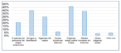 Los resultados arrojados, demuestran las tendencias actuales hacia un mayor empleo de las tecnologías de la información y las comunicaciones. Según los datos obtenidos, el 46% del total de turistas encuestados posicionan a las páginas web sobre Cuba como la principal fuente de información utilizada en la planificación del viaje; seguidas de las experiencias de amigos y familiares (39.80%) y las redes sociales en Internet (38.90%). Por otra parte, las fuentes menos utilizadas para la obtención de la información son aquellas incluidas en las categorías de otras páginas web (3.50%), otras vías (4.40%) y guías turísticas (libros) con un 6.20% (Figura 4).