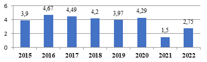 En Cuba, las llegadas de visitantes franceses respecto al total de llegadas turísticas, ha mantenido un comportamiento similar desde 2015 hasta 2020 representando el 3.9%, 4.67%, 4.49%, 4.2%, 3.97% y 4.29% respectivamente (Figura 1). Durante el año 2021, la representatividad del mercado francés se ve disminuida hasta el 1.5%, que además coincide con el año de menor flujo turístico en el país, consecuencia de las limitaciones acarreadas a partir de la COVID-19. Sin embargo, para el año 2022 con la recuperación del turismo en la isla, se observa una recuperación del mercado francés ascendiendo al 2.75% (ONEI, 2022a).