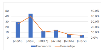 En cuanto al indicador edad, se caracteriza por la heterogeneidad de los datos recopilados, los cuales varían desde los 20 hasta 72 años. La edad media del turista francés es de 37 años aproximadamente, con un valor central de 34 años. La presencia de valores relativamente altos en el conjunto de datos eleva la media, lo que sugiere que en este conjunto de datos no tiene un valor representativo (debido a la presencia de valores extremos) ya que no indica con exactitud el valor alrededor del cual tienden a agruparse las edades. Los encuestados más frecuentes son aquellos que se encuentran en un rango de edad entre 29 y 38 años, representando el 39.8%. Por otro lado, las edades menos frecuentes se manifiestan a partir de los 56 años. Por lo que, el destino se encuentra entre las preferencias de los jóvenes franceses fundamentalmente; constituyendo el grupo de mayor relevancia para futuros proyectos y enfoques de la oferta (Figura 2).