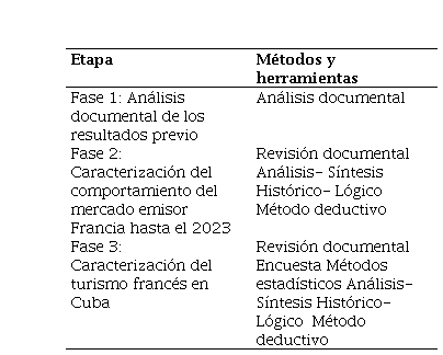 La investigación realizada de acuerdo con Hernández - Sampieri & Mendoza (2018) se clasifica como descriptiva. En esta se describen las características actuales del turista francés. Además, es clasificada como de naturaleza cuantitativa y cualitativa, debido a que se utilizan también análisis matemáticos y descripciones cualitativas. A partir de ello se estableció una trayectoria metodológica que consta de 3 fases tal y como se muestra en la Tabla 1.