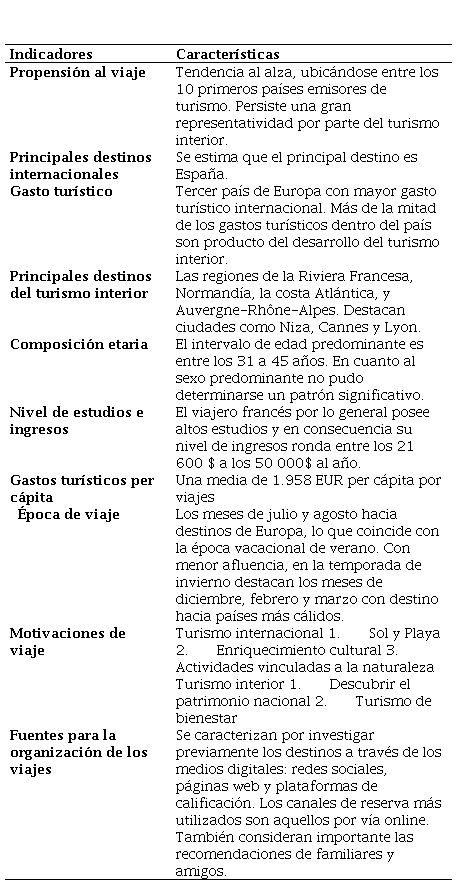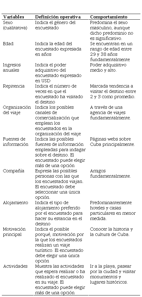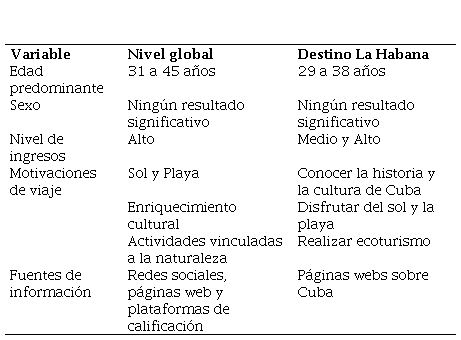 A partir de los resultados obtenidos con el procesamiento de las encuestas, se han agrupado características que describen el comportamiento del turista francés que visita el destino La Habana, lo que favorecerá la gestión de este mercado (Tabla 4).