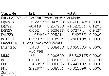 Table 3 presents the outcome for the cointegration bounds tests. At 5%, the I(0) and I(1) bounds level are 2.86 and 4.01, respectively. With the F-statistic of 1562.50 greater than the I(1) bound, this indicates that the test is significant and the null cannot hold. Evidently, the outcome supposes the existence of a long-run relationships for the series in the ROI’s model of equation (2). Table 4 presents the ROI model’s regression coefficients for the short (long) run in Panel A (B). The F-statistic outcome shows that the entire model is significant, judging from its p-value (0.000) less than 5%. This signifies that the model is in good fit. The F-statistic better measures the goodness of fit relative to the R-squared (R^2), since usually, the empirical outcomes may be misled by a high R^2 due to the inclusion of the lagged terms of explanatory variables.