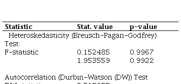 (of 1.953) and F-statistic (of 0.152) have p-values of 0.9922 and 0.9967, respectively, supposing no sufficient evidence to reject the null of constant variance of residuals. Moreso, with a Durbin-Watson (DW) statistic of 2.313, the evidence supposes absence of autocorrelation problem.