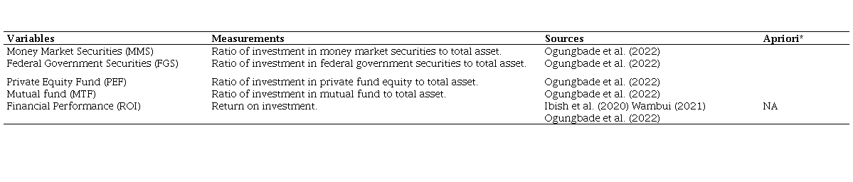 Most previous studies carried out on investment securities and financial performance of the PFAs primarily focused on other countries, such as Kenya (Kennedy, 2021; Mungai & Ochieng, 2018; Kinyua et al. (2022). Specific studies in the Nigerian context, Ogungbade et al. (2022), are limited to investment only in long-term securities, including ordinary shares, real estate properties, corporate debt. Because short-term securities have also experience growth, especially with inflow of funds from the PFAs, the paper attempts to apply available data based on the different types of investment securities to examine their impact on the PFAs’ financial returns. Examining this offers a more comprehensive understanding of the relationship between investment securities and the performance of PFAs in Nigeria.
