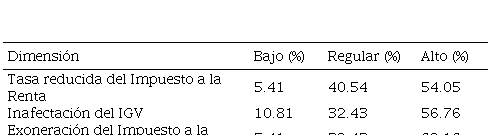 La tabla 1 muestra los resultados obtenidos a partir de la evaluación de la variable beneficios tributarios, la cual fue desagregada en tres dimensiones: tasa reducida del Impuesto a la Renta, inafectación del IGV y exoneración del Impuesto a la Renta.