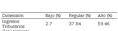La Tabla 2 muestra los resultados obtenidos para la variable recaudación tributaria, evaluada a través de dos dimensiones: ingresos tributarios y conocimiento tributario.