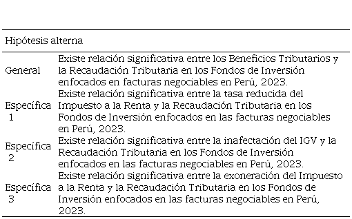 En este contexto, el estudio se orienta responder la siguiente interrogante principal: ¿De qué manera se relaciona los beneficios tributarios y la recaudación tributaria en los fondos de inversión enfocados en Facturas negociables en Perú? Y las siguientes interrogantes específicas: ¿En qué medida se relaciona la tasa reducida del Impuesto a la Renta con la recaudación tributaria en los fondos de inversión enfocados en Facturas negociables en Perú? ¿En qué medida se relaciona la inafectación del IGV y la recaudación tributaria en los fondos de inversión enfocados en Facturas negociables en Perú? ¿En qué medida se relaciona la exoneración tributaria del Impuesto a la Renta y la recaudación tributaria en los fondos de inversión enfocados en Facturas negociables en Perú?