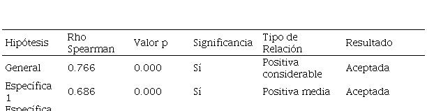 Con el objetivo de contrastar las relaciones planteadas entre las variables del estudio, se procedió a realizar la prueba de hipótesis correspondiente. La investigación partió de una hipótesis general y tres hipótesis específicas que a continuación describimos.