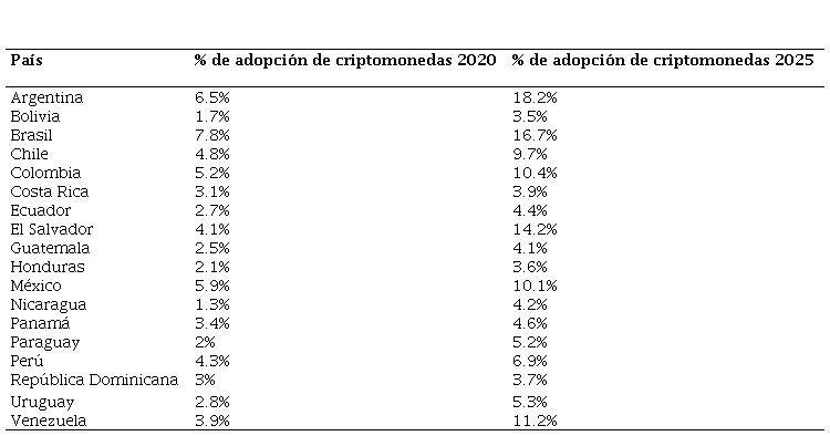 En la siguiente tabla es observable el cambio de la adopción de criptomonedas entre 2020 al 2025 por parte de países latinoamericanos. Asimismo, es notable el aumento del uso de estas en Argentina y Venezuela, los cuales han sido impulsados por los problemas inflacionarios de sus economías, por lo cual han fungido como una forma de pago y de obtención de rendimientos alternativa a las tradicionales.