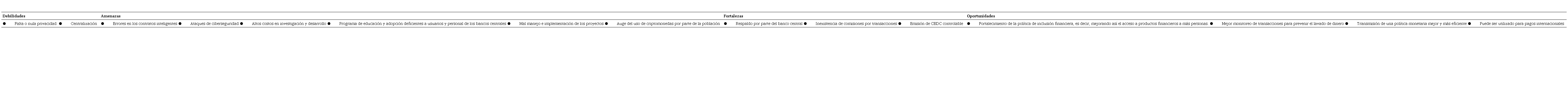La razón para elegir una matriz FODA dinámica sobre la matriz FODA tradicional es que la primera es una herramienta de análisis estratégico que no solo se enfoca en errores, problemas, éxitos y metas, sino que también tiene en cuenta la naturaleza dinámica del entorno empresarial. La tabla detalla el FODA dinámico según Carnap (2013). La tabla muestra las fortalezas, que se centran en los casos de los proyectos de CBDC lanzados y llevados a cabo por el Banco de Jamaica, Sand Dollar de las Bahamas y eNaira de Nigeria. Las oportunidades se centran en los objetivos de un proyecto de moneda digital del banco central. Por otro lado, las debilidades se basan en errores o actividades que pueden presentar algún tipo de pérdida, mientras que las amenazas están relacionadas con los problemas que pueden enfrentarse.