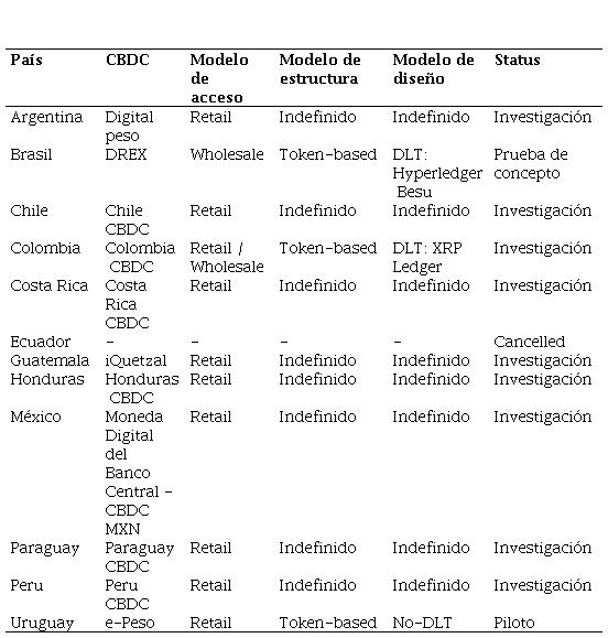 En la siguiente tabla se puede observar que Argentina, Chile, Costa Rica, Guatemala, Honduras, México, Paraguay y Perú están en la fase de investigación para sus CBDC enfocadas en el comercio minorista, con la estructura y el diseño aún por definir.