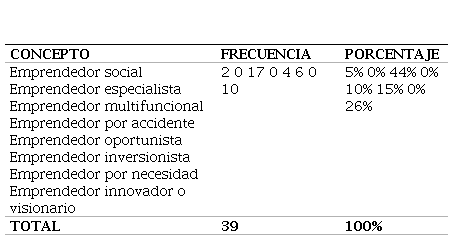 Según la encuesta aplicada a 39 egresados emprendedores del programa de Administración de Empresas de la Universidad Francisco de Paula Santander Ocaña, se destaca el emprendedor multifuncional con el 44%, seguido por un 26% que se considera innovador o visionario. El 15% corresponde a emprendedores inversionistas, el 10% a oportunistas y el 5% a emprendedores sociales. No se reportaron casos de emprendedores especialistas, por accidente ni por necesidad.
