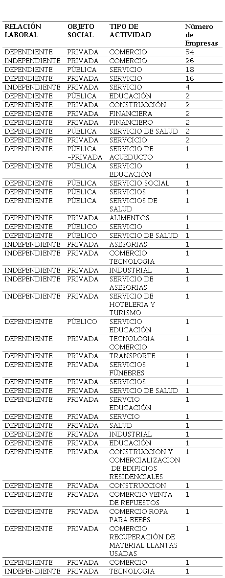 Síntesis: El análisis de los datos de la tabla 5, revela que la mayoría de las personas se desempeñan bajo una relación laboral dependiente en el sector privado, con una marcada concentración en actividades comerciales y de servicios. El comercio se posiciona como la actividad económica predominante, tanto para trabajadores dependientes como independientes, lo que refleja una tendencia hacia iniciativas empresariales tradicionales. Aunque en menor proporción, también se observa participación en sectores como salud, educación, tecnología, asesorías e industria, lo que evidencia una incipiente diversificación económica. Este panorama sugiere la necesidad de fortalecer políticas de apoyo que promuevan el emprendimiento en sectores emergentes, al tiempo que se estandarizan las categorías de actividad para facilitar un análisis más estructurado.