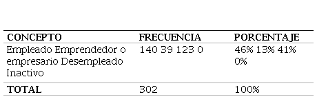 Según los resultados de la encuesta aplicada a 302 graduados del programa de Administración de Empresas de la Universidad Francisco de Paula Santander Ocaña, el 46% se encuentra empleado, el 13% son emprendedores o empresarios, el 41% está desempleado y ninguno se declaró inactivo laboralmente.