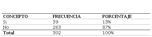 De los 302 graduados encuestados del programa de Administración de Empresas de la Universidad Francisco de Paula Santander Ocaña, solo el 13% ha creado una empresa, mientras que el 87% no lo ha hecho, evidenciándose un resultado bajo, que podría traducirse en que los graduados tienen mayor interés en ser empleados, que en desarrollar iniciativas propias.