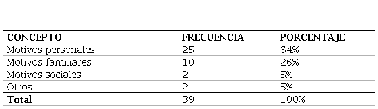 Entre los 39 graduados que han creado empresa, el 64% lo hizo por motivos personales, el 26% por razones familiares, mientras que los motivos sociales y otros representaron cada uno el 5%. Estos datos provienen de una encuesta aplicada a egresados de Administración de Empresas de la Universidad Francisco de Paula Santander Ocaña.