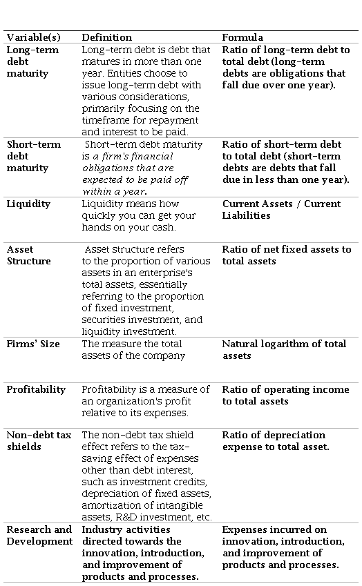 Additional recent evidence underscores that financial flexibility and innovation capacity shape maturity choices. Nakatani (2023) found that firms with greater intangible assets (which often correlate with R&D-intensity) tend to have greater short-term debt relative to long-term debt, suggesting a preference for shorter maturities, while (Frank and Goyal (2009) observed that firms with strong investment discipline adopt longer maturities, leveraging stable internal financing. (Kim and Park, 2024; Jeenas, 2023) observed during the COVID-19 crisis that firms with better liquidity management and credible disclosure extended debt maturities, contrasting with smaller or opaque firms forced into shorter-term borrowing. Wang, Wang, and Xu (2023) further showed that firms with higher disclosure quality reduce rollover risk through longer-term contracts, reinforcing the governance-maturity linkage.