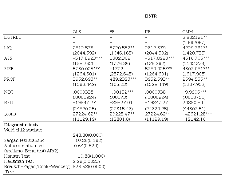 These findings demonstrate that GMM outperforms OLS, FE, and RE estimators in terms of efficiency and consistency. For instance, while the static estimators (OLS, FE, RE) suggest mixed significance among firm-level variables, the GMM results reveal that Liquidity (LIQ), Asset Structure (ASS), Firm Size (SIZE), and Profitability (PROF) exert significant positive effects on DSTR, in line with theoretical expectations that larger, more liquid, and more profitable firms can secure long-term financing (Ozkan, 2000; Antoniou et al., 2006). The improvement in significance and stability of coefficients under GMM implies that the static models likely suffered from omitted variable bias or simultaneity.