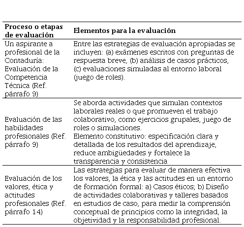 La tercera fase consistió en establecer el proceso de evaluación, diferenciando entre las competencias técnicas, las habilidades profesionales y los valores éticos. Para cada tipo de competencia se definieron métodos específicos, con base en las recomendaciones del International Accounting Education Standards Board (2015), incorporando tanto estrategias de evaluación formativa como sumativa. Se contemplaron actividades como exámenes escritos, estudios de caso, aprendizaje basado en problemas, trabajo colaborativo, simulaciones, diarios de aprendizaje y ejercicios de evaluación en el lugar de trabajo, entre otros.