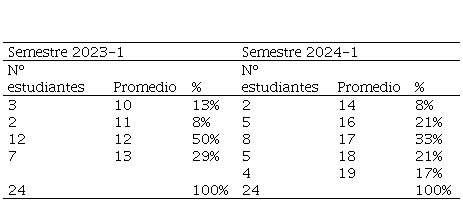 Al analizar la distribución relativa respecto a la media, se observa que en el grupo 2024-1 el 71% de los estudiantes se ubicó por encima de ella y no hubo desaprobados. En contraste, en el grupo 2023-1 el 21% estuvo por debajo de la media y tres estudiantes no alcanzaron la nota mínima aprobatoria. Estos resultados refuerzan la hipótesis de que el uso de rúbricas mejora no solo la claridad y transparencia del proceso evaluativo, sino también los resultados académicos en términos de logro de competencias.