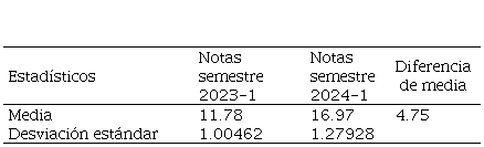 En términos estadísticos, el grupo 2024-1 alcanzó una media de 16.97 puntos, frente a los 11.78 del grupo 2023-1, lo cual representa una diferencia de más de cinco puntos. La desviación estándar fue ligeramente mayor en el grupo 2024-1 (1.27 frente a 1.00), lo que indica una mayor dispersión, pero dentro de un rango de calificaciones altas. Esta comparación se resume en la Tabla 6.