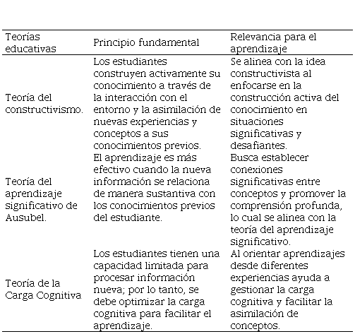 En la segunda fase, se diseñó el modelo pedagógico de las sesiones de clase, incorporando fundamentos de diversas teorías educativas compatibles con el enfoque por competencias, se visualiza en la tabla 2.Estas teorías orientaron tanto el diseño de las actividades formativas como la definición de los indicadores de evaluación, buscando garantizar un aprendizaje profundo, contextualizado y socialmente significativo.