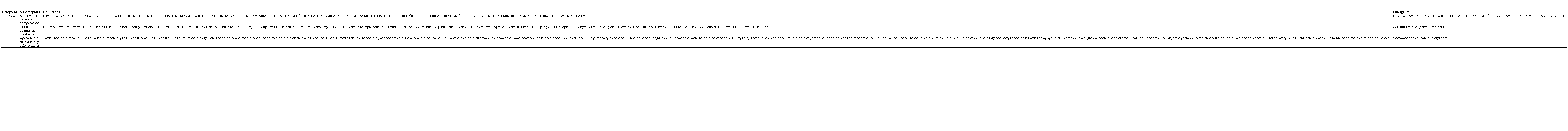 El proceso de adquisición de conocimiento y aumento de la motivación en el ser humano resulta ser crucial ante el desarrollo de la investigación formativa para la ciencia, tecnología e innovación. En efecto, la oralidad procede de un proceso inherente de comunicación dialógica de ideas e información entre los seres humanos; así, la oralidad dentro del contexto educativo emerge como fuente potenciadora de redes de apoyo para trasformar la realidad ante la comprensión. De esta manera, el presente apartado pretende realizar un análisis sistemático teniendo en cuenta las categorías, subcategorías y las emergentes encontradas (véase tabla 1, en donde se presentan las categorías y subcategorías que surgen del estado del arte realizado y las emergentes que surgen a partir del análisis de las entrevistas).