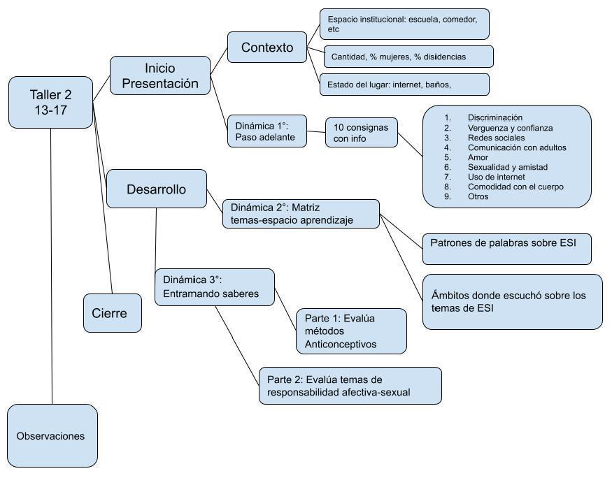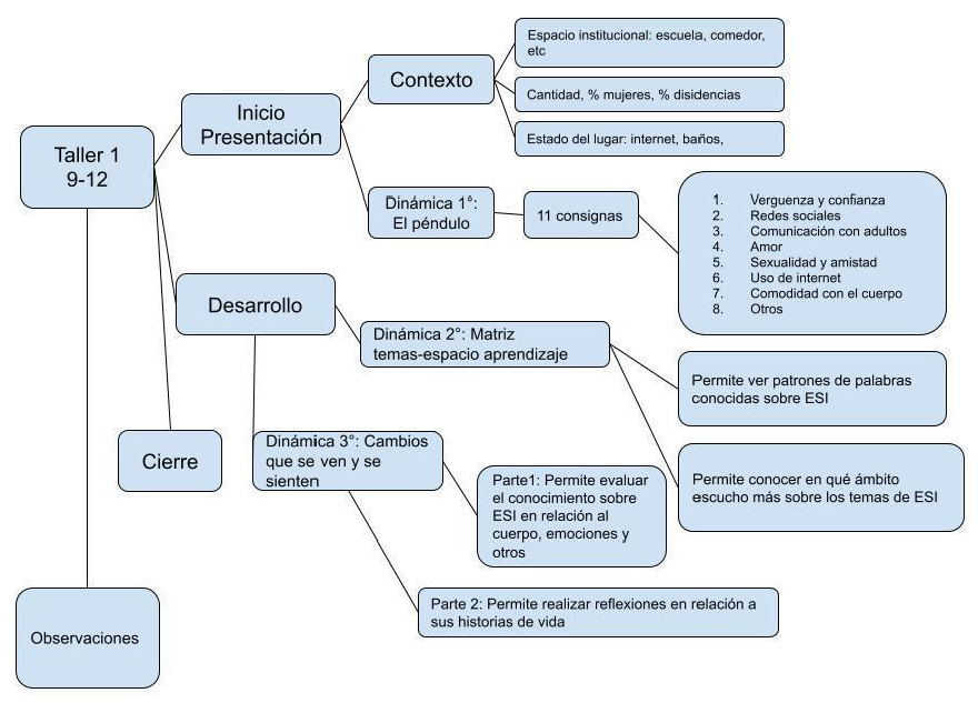 En lo práctico, el taller demandó la elaboración de cuatro materiales o herramientas para cada grupo etario: un cuadernillo de contenidos mínimos, para poner al tanto a los talleristas sobre las temáticas que serían evaluadas y servir como auxilio para responder preguntas y saber cómo abordarlas; un manual con instrucciones metodológicas, materiales requeridos y sugerencias para las dinámicas planteadas en el taller, de manera que cada par pedagógico pudiera prepararlo rigurosamente; un cuadernillo sobre la temática, que sería repartido a los participantes una vez finalizada toda la actividad; y una planilla de anotaciones grillada, que solicitaba datos contextuales sobre el desarrollo del taller, la trayectoria del grupo e información específica sobre los factores a observar en cada dinámica, dejando espacios para observaciones adicionales que pudieran escaparse a lo esperado.