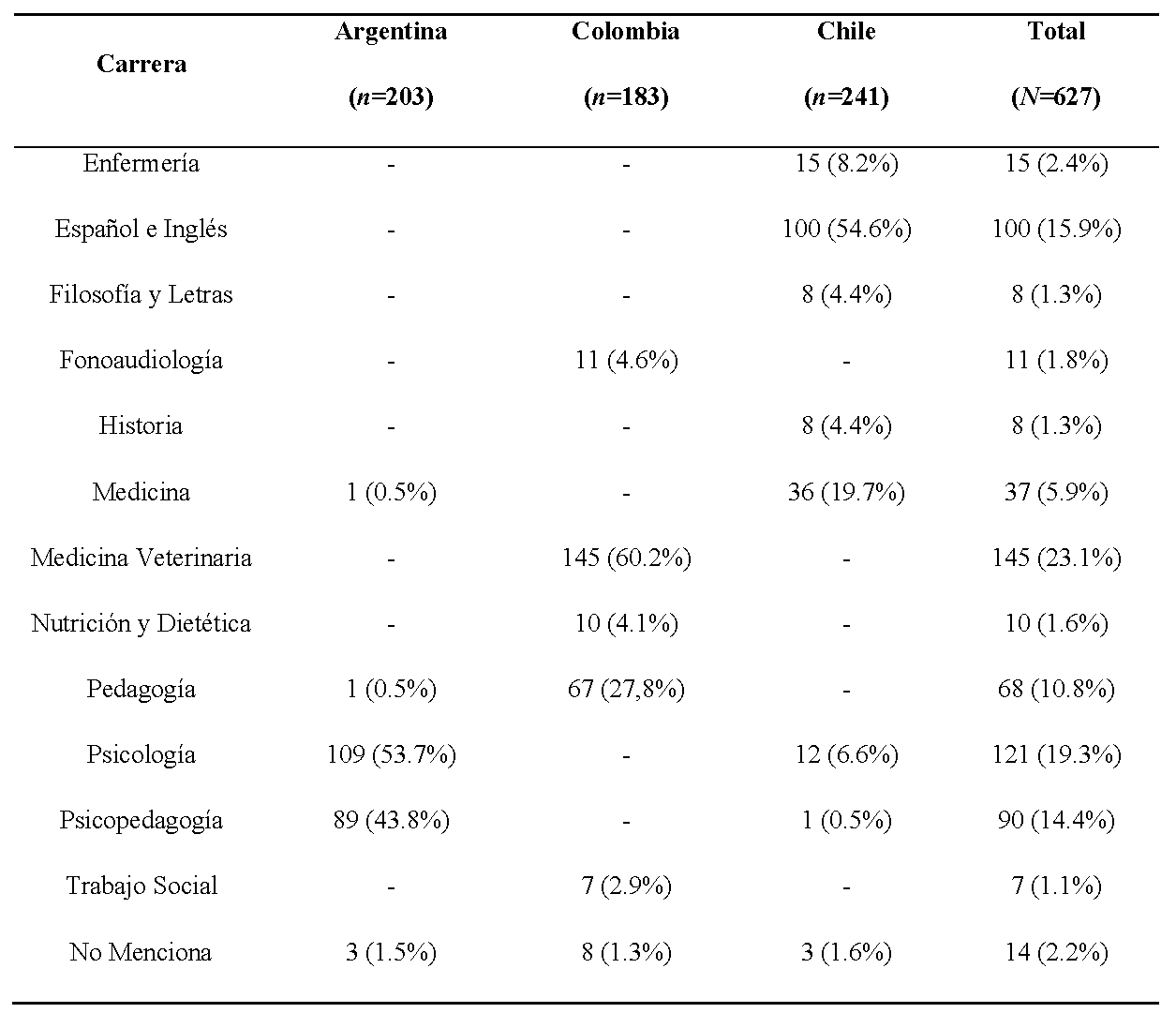 Por país, se observa que Argentina concentró principalmente estudiantes de Psicología (53,7 %) y Psicopedagogía (43,8 %), con muy baja participación en otras carreras; Colombia se caracterizó por la predominancia de Medicina Veterinaria (60,2 %), seguida de Pedagogía (27,8 %), con presencia menor en Fonoaudiología y Nutrición. Chile presentó una diversidad mayor, destacando Español e Inglés (54,6 %) y Medicina (19,7 %), además de Enfermería y Psicología en proporciones menores. Estos datos pueden observarse en la Tabla 1. Por lo tanto, dichas carreras podrían ordenarse en dos grupos: (a) Salud (Enfermería, Fonoaudiología, Medicina, Medicina Veterinaria, Nutrición y Dietética, Psicología) y (b) Educación y Humanidades (Pedagogía, Psicopedagogía, Español e Inglés, Filosofía y Letras, Historia, Trabajo Social). Esta macroagrupación puede visualizarse en la Tabla 2.